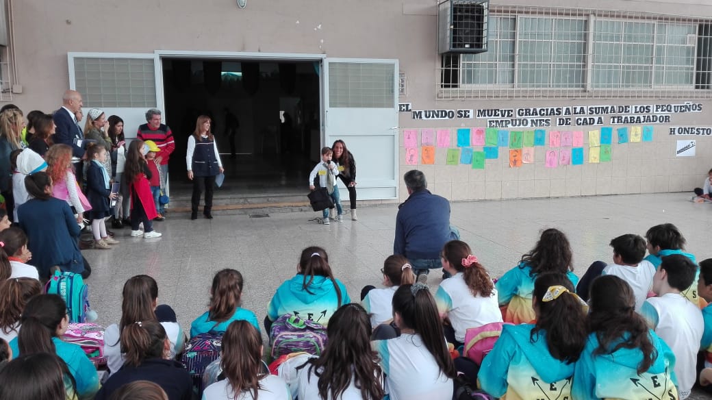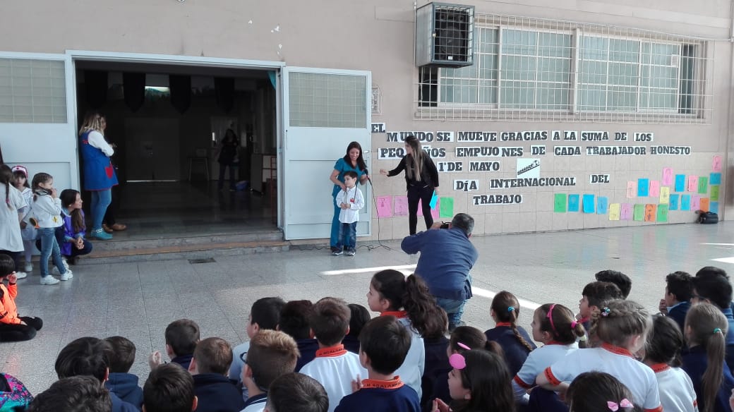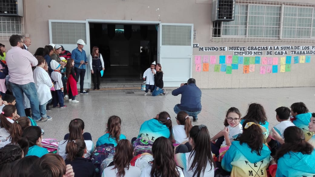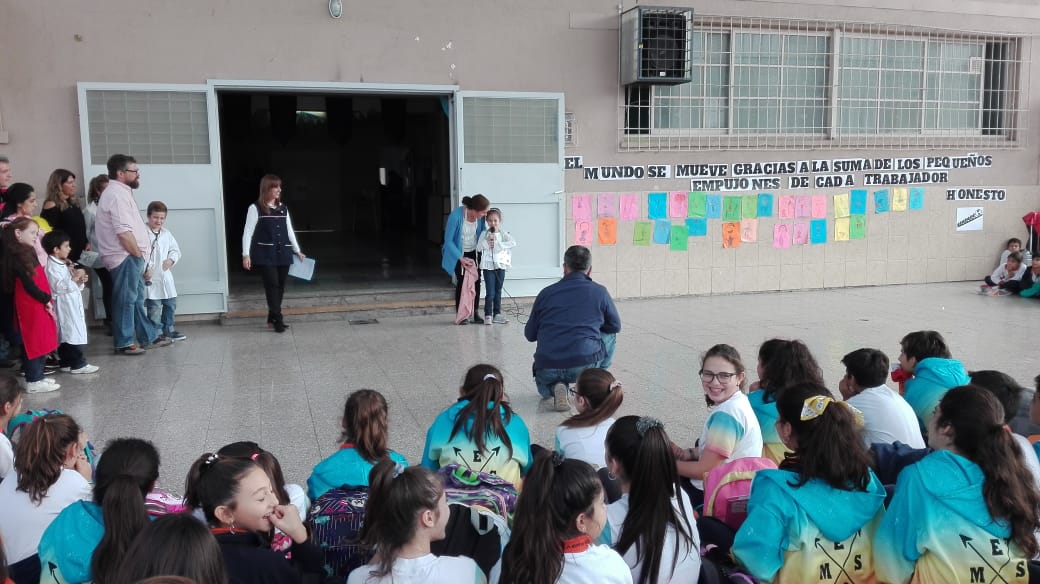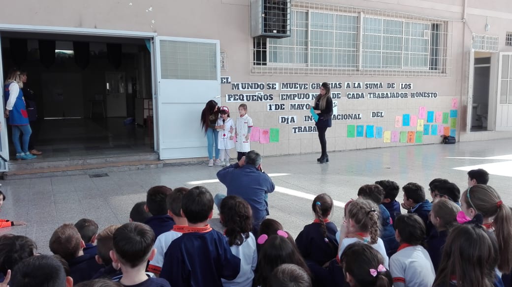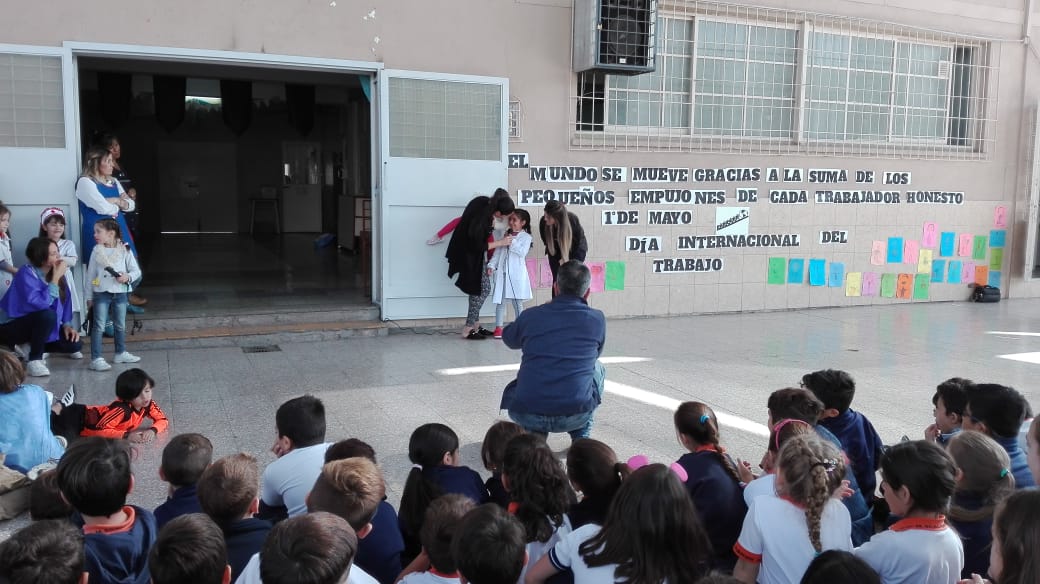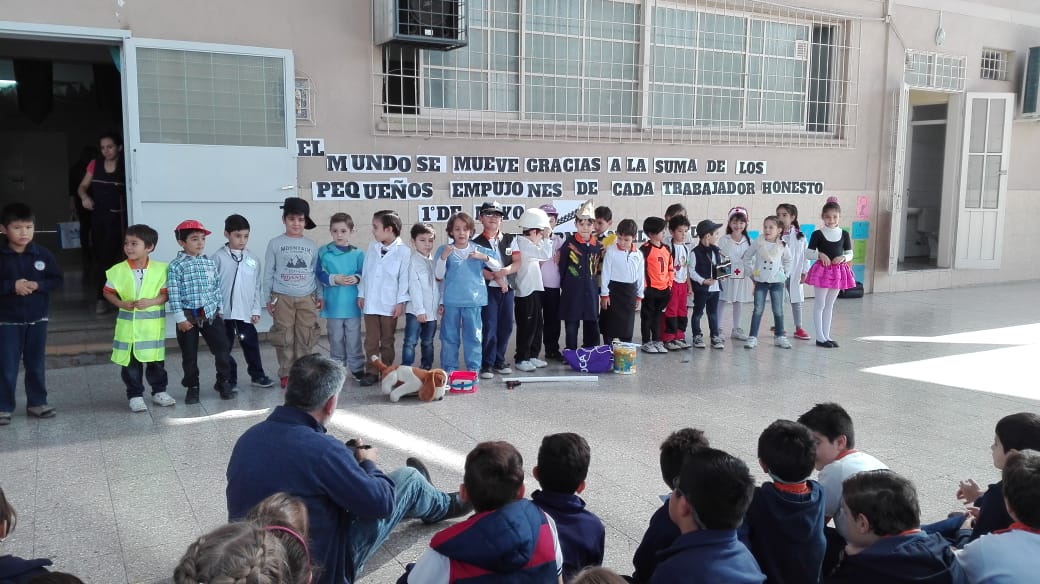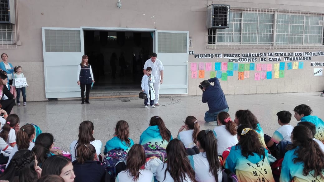 Los alumnos de primer grado, acompañados de sus familias, fueron los encargados de darle vida a este acto en el que los niños y sus padres representaban una profesión y a través de un verso contaban cual es la tarea que realiza.