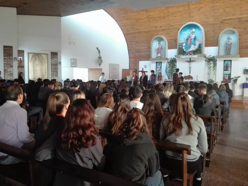 Los alumnos de Nivel Primario presenciaron un Vía Crucis viviente dentro de la institución. En el acto se narró la Pasión de Cristo que se inició con el juicio de Pilatos ante el pueblo hebreo y finalizó con la muerte de Cristo. Posteriormente se realizó un corto pero emotivo encuentro en la iglesia a cargo del Padre Francisco.