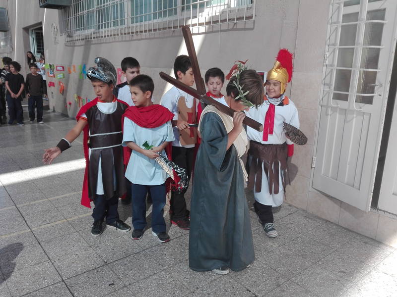 Los alumnos de Nivel Primario presenciaron un Vía Crucis viviente dentro de la institución. En el acto se narró la Pasión de Cristo que se inició con el juicio de Pilatos ante el pueblo hebreo y finalizó con la muerte de Cristo. Posteriormente se realizó un corto pero emotivo encuentro en la iglesia a cargo del Padre Francisco.