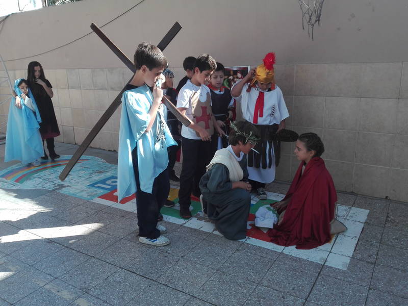 Los alumnos de Nivel Primario presenciaron un Vía Crucis viviente dentro de la institución. En el acto se narró la Pasión de Cristo que se inició con el juicio de Pilatos ante el pueblo hebreo y finalizó con la muerte de Cristo. Posteriormente se realizó un corto pero emotivo encuentro en la iglesia a cargo del Padre Francisco.