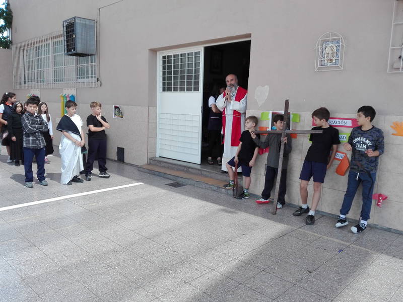 Los alumnos de Nivel Primario presenciaron un Vía Crucis viviente dentro de la institución. En el acto se narró la Pasión de Cristo que se inició con el juicio de Pilatos ante el pueblo hebreo y finalizó con la muerte de Cristo. Posteriormente se realizó un corto pero emotivo encuentro en la iglesia a cargo del Padre Francisco.