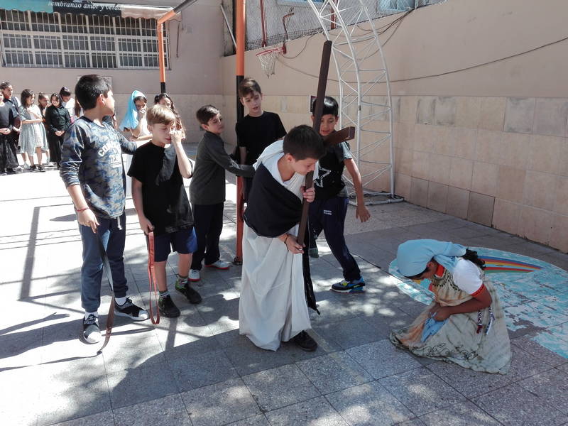 Los alumnos de Nivel Primario presenciaron un Vía Crucis viviente dentro de la institución. En el acto se narró la Pasión de Cristo que se inició con el juicio de Pilatos ante el pueblo hebreo y finalizó con la muerte de Cristo. Posteriormente se realizó un corto pero emotivo encuentro en la iglesia a cargo del Padre Francisco.